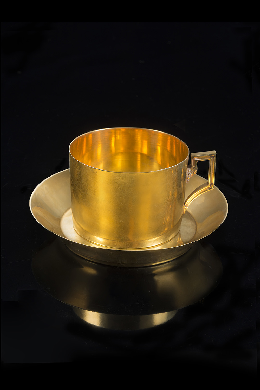 Tazza con piattino in oro ad un'ansa di forma squadrata, cesellata a motivi vegetali. Argentiere Miracoli. Titolo 750 (g 466 ca.) (lievi difetti)