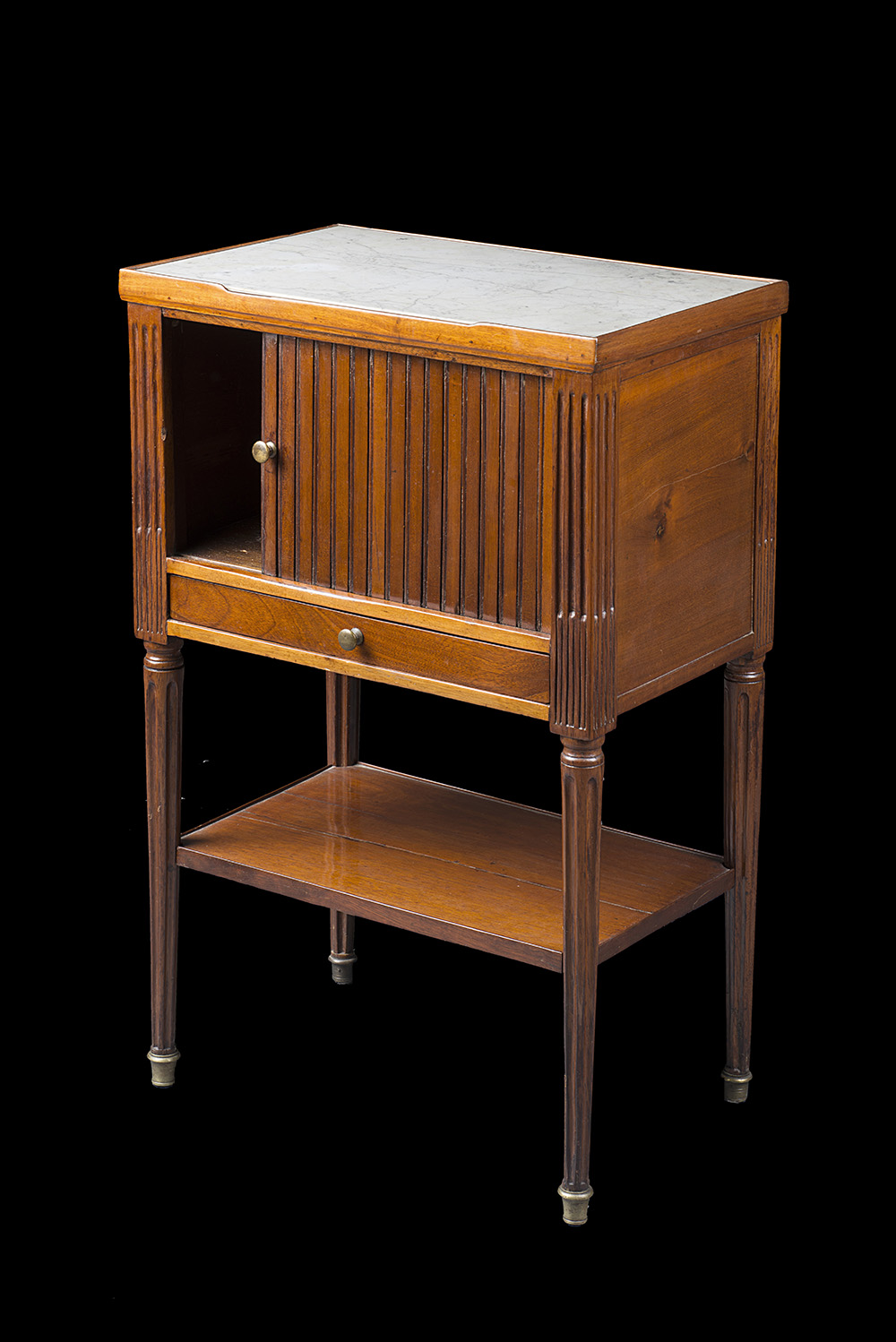Comodino lastronato in mogano con piano in marmo, anta scorrevole e cassetto. Montanti e gambe scanalate riunite da pianetto e munite di scarpette in bronzo. Francia, fine secolo XIX (cm 48x74,5x31,5) (difetti)