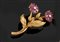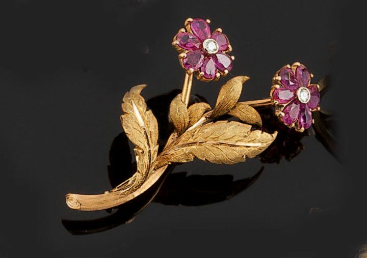 Spilla in oro giallo a forma di ramo fiorito con rubini taglio a goccia e due piccoli diamanti taglio brillante