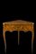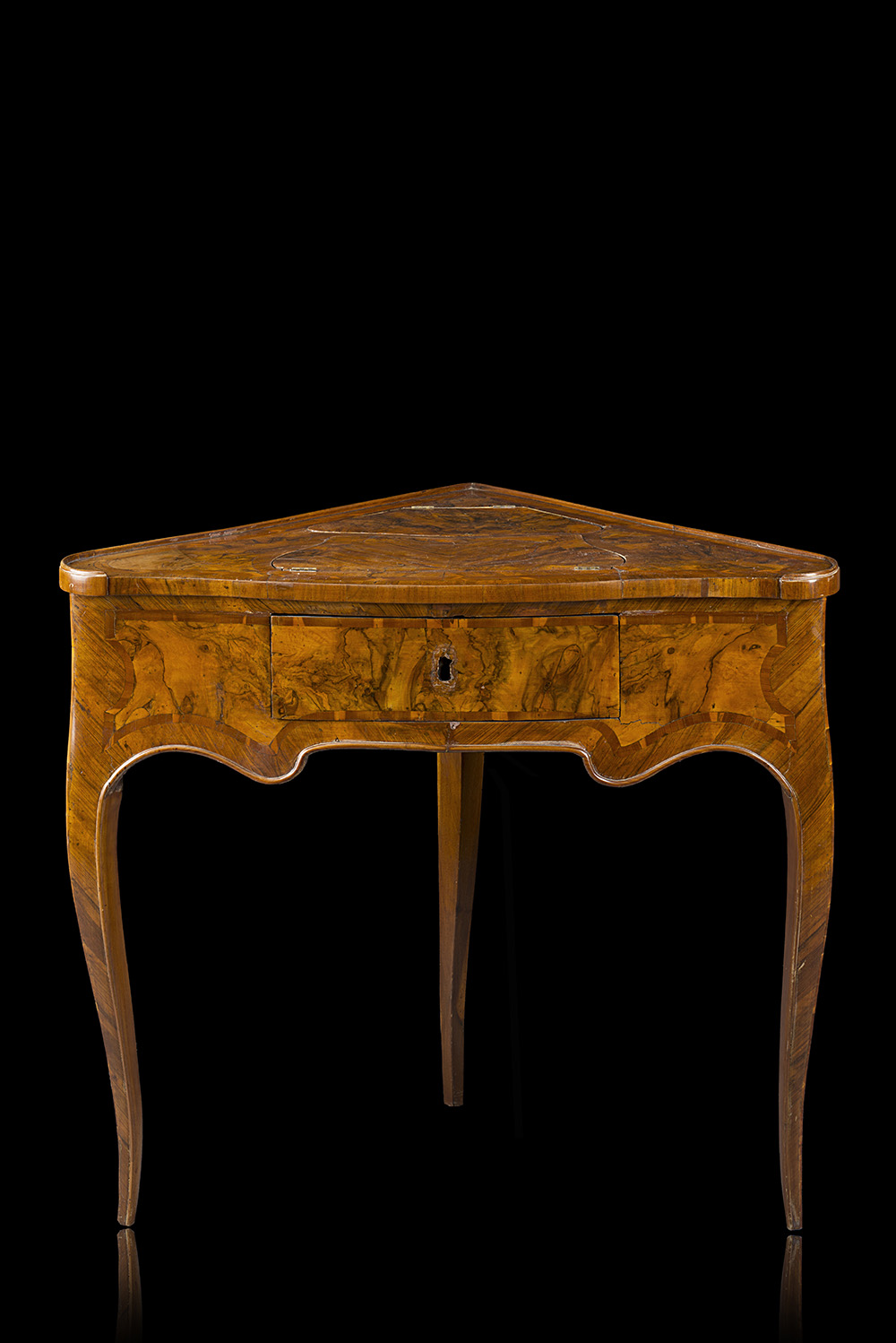 Scrittoio da centro di forma triangolare lastronato in noce, palissandro e legni vari. Piano sagomato con leggio estraibile e vano porta calamaio. Fascia ad un cassetto decorata da specchiature in radica entro cornici in legno di testa. Gambe mosse. Liguria, secolo XVIII (cm 94x82x60) (difetti)