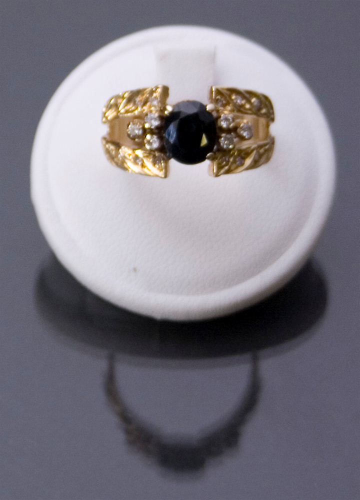 Anello in oro giallo, con al centro zaffiro di taglio ovale ed ai lati sei diamantini taglio brillante