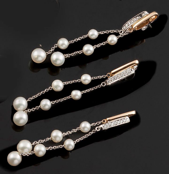 Demi-parure composta da una coppia di orecchini ed un ciondolo in oro bianco e giallo con diamantini taglio brillante e piccole perline pendenti