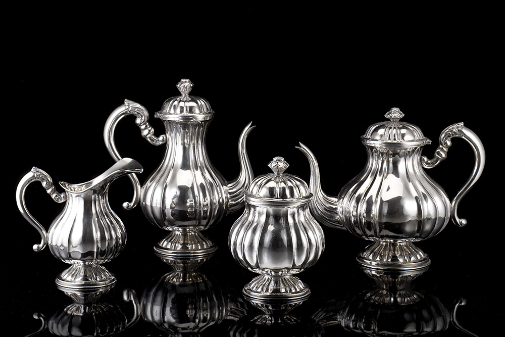Servizio da tè e caffè in argento composto da caffettiera, teiera, zuccheriera e lattiera; con corpi a balaustro sagomati a baccellature e costolature verticali. Italia, fine secolo XIX - inizi secolo XX (h. max cm 23,5 ca.) (g tot. 1530 ca.) (difetti)