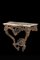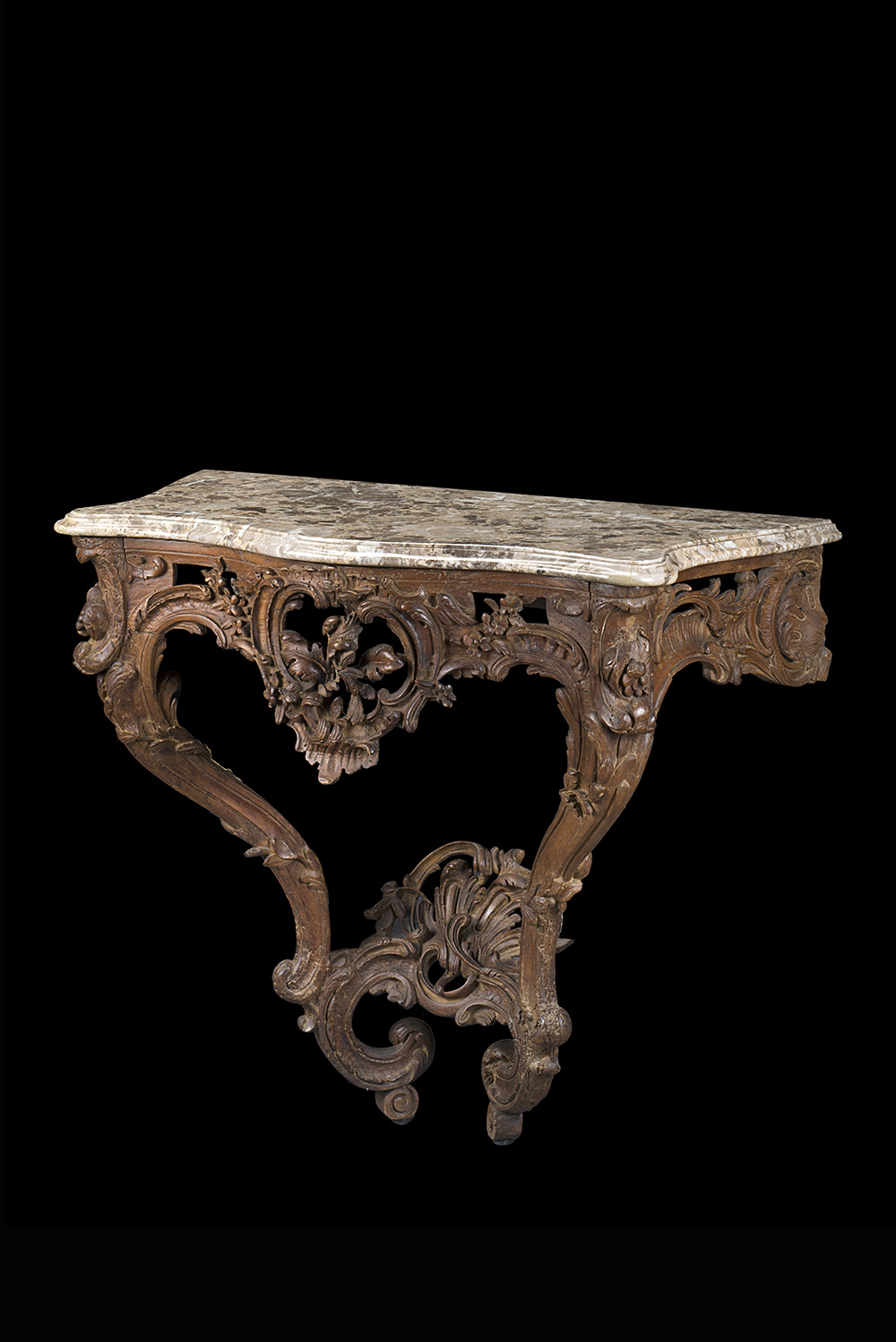 Consolle in rovere intagliato, grembiale centrato da girali di foglie e fiori traforati. Gambe mosse riunite da elemento fogliaceo. Piedi a ricciolo. Piano in marmo. Francia, secolo XVIII (cm 103x91x53) (difetti e restauri)