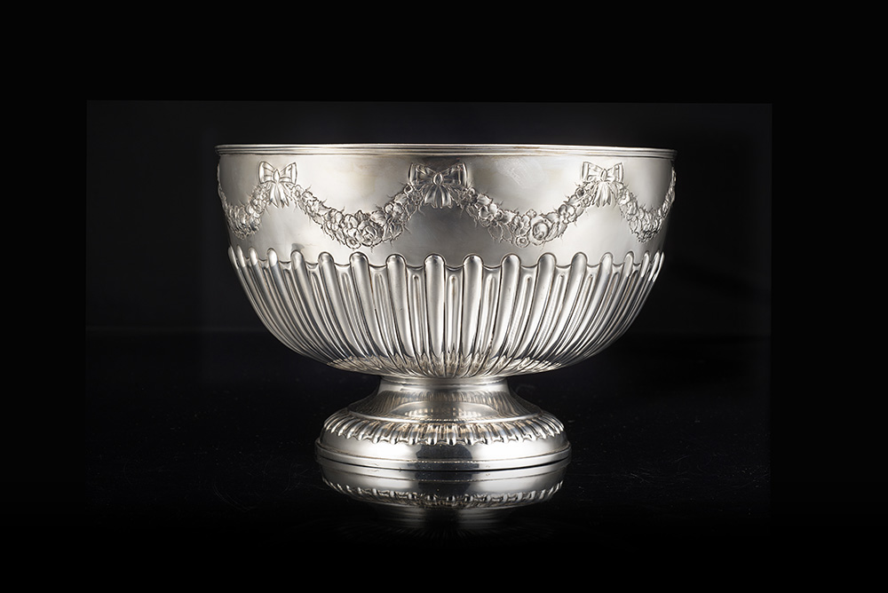 Bowl in argento decorata da fasce di baccellature radiali e festoni di fiori, con orlo modanato. Londra, 1898. Argentiere William Hutton & Son LTD (d. cm 31 ca.; h. cm 20 ca.) (g 1490 ca.) (lievi difetti)