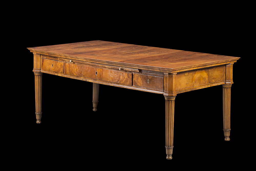 Tavolo da biblioteca lastronato in mogano e piuma di mogano. Fascia a tre cassetti e due tiretti rivestiti in elle impressa in oro. Gambe scanalate terminanti a piedi torniti e decorate all'attacco da capitello esagonale. Lombardia, secolo XIX (cm 213,3x86,2x108,4) (difetti)