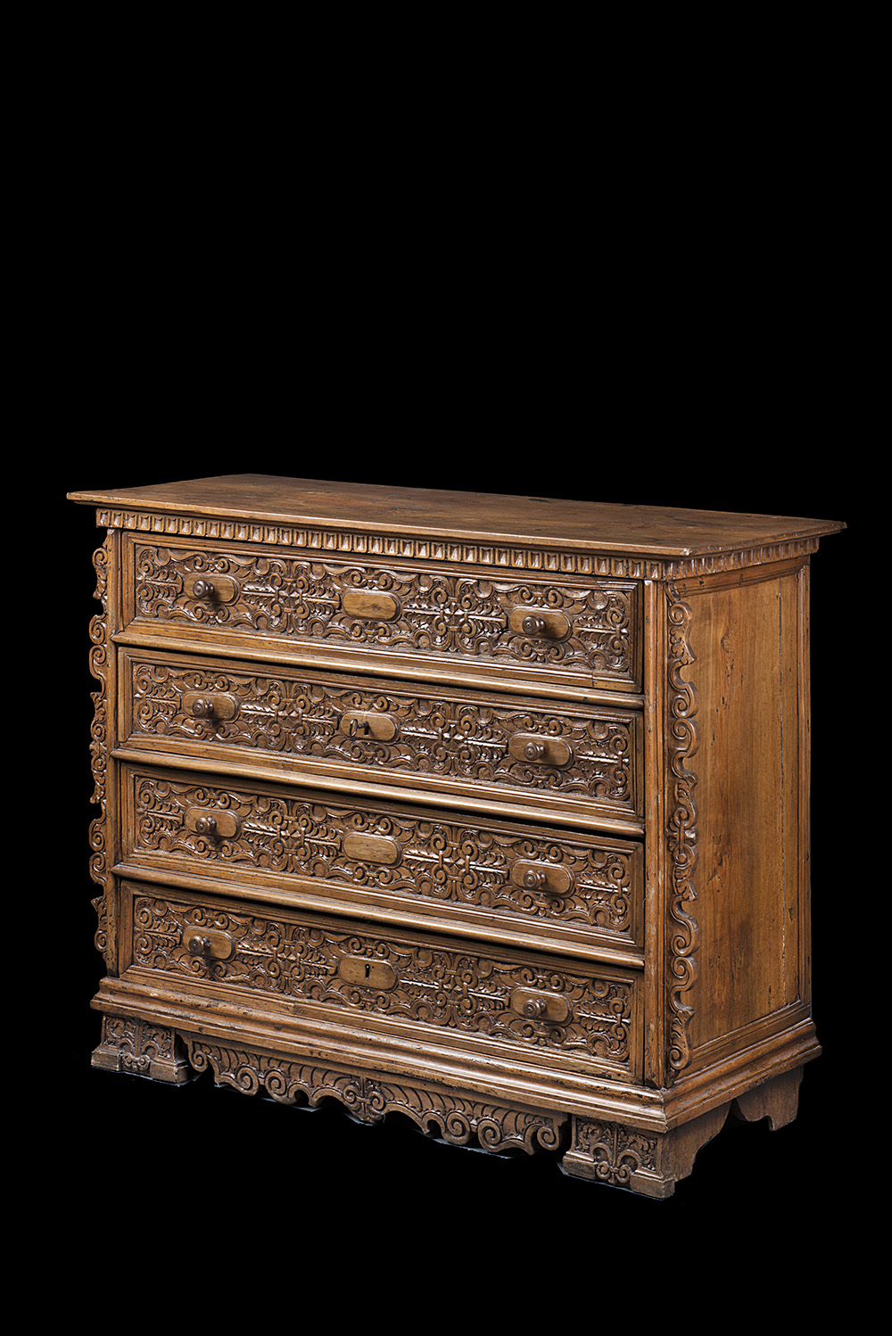 Cassettone in noce intagliato a girali di foglie a quattro cassetti tra lesene aggettanti. Piedi a mensola. Friuli, secolo XVII (cm 147x116x62) (restauri)