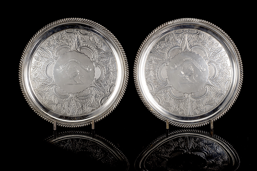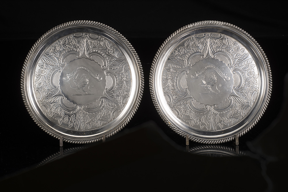 Coppia di salver in argento con fondo inciso con emblema e motto ‘ROBORE PRUDENTIA PRAESTAT’ e cesellato successivamente a motivi floreali e volute; bordura godronata. Edimburgo, 1795 o 1821. Argentiere George McHattie (d. cm 28 ca.) (g 1610 ca.) (lievi difetti)
