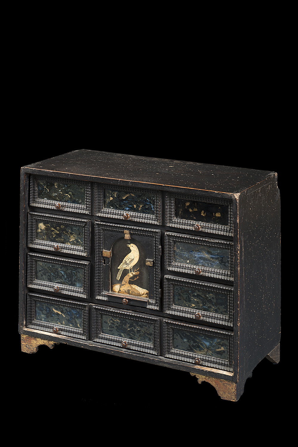 Monetiere in legno ebainizzato a due cassetti grandi e quattro piccoli decorati a verre peint. Anta centrale con pannello in scagliola decorato a volatile su ramo. Piedi a mensola. Secolo XVII (cm 60x46x26,5) (difetti e mancanze)