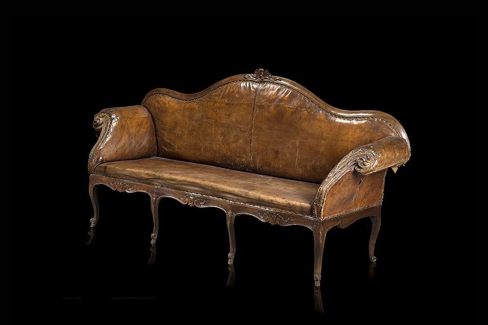 Divano a orecchioni in noce con schienale e braccioli sagomati e intagliati a volute fogliate. Fascia e gambe mosse. Rivestito in cuoio. Lombardia, secolo XVIII (l. cm 224) (difetti)