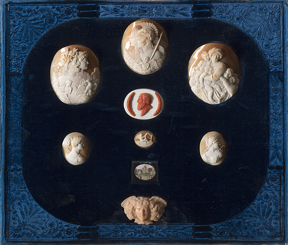 Teca contenente otto cammei intagliati a figure classiche, putti e volti femminili e un micromosaico con una veduta di Piazza San Pietro. Secolo XIX / XX (cm 28x30) (difetti)