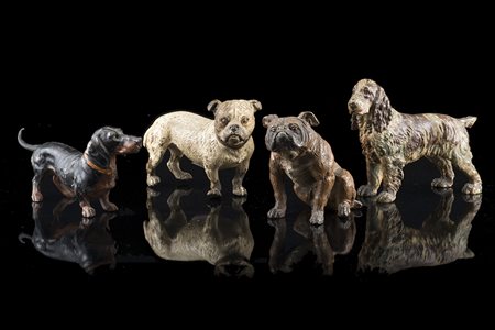 Manifatture diverse, secolo XX. Gruppo di quattro cani in metallo smaltato in policromia (un Bassotto, un Cocker e due Bulldog) (difetti)