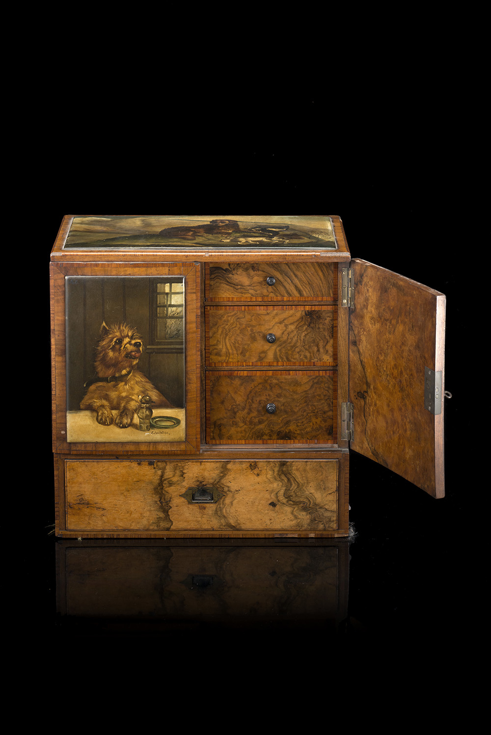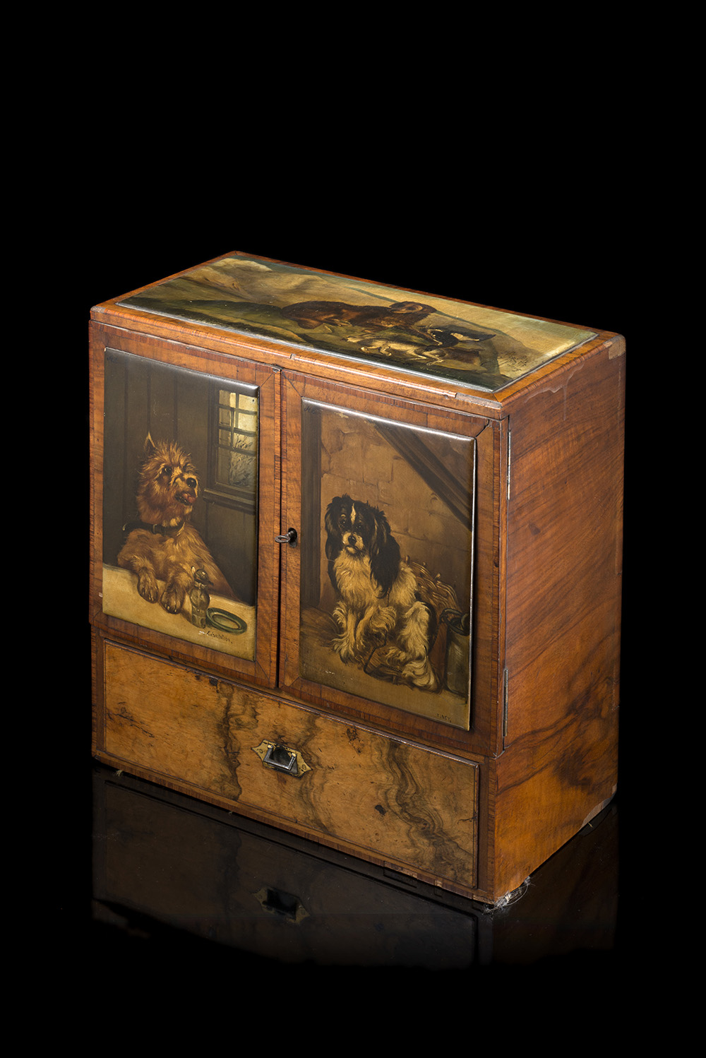 A burr veneered cabinet painted with portraits of dogs signed and dated "Hard Earl 89". England, late 19th century (cm 35x28x35) (defects)