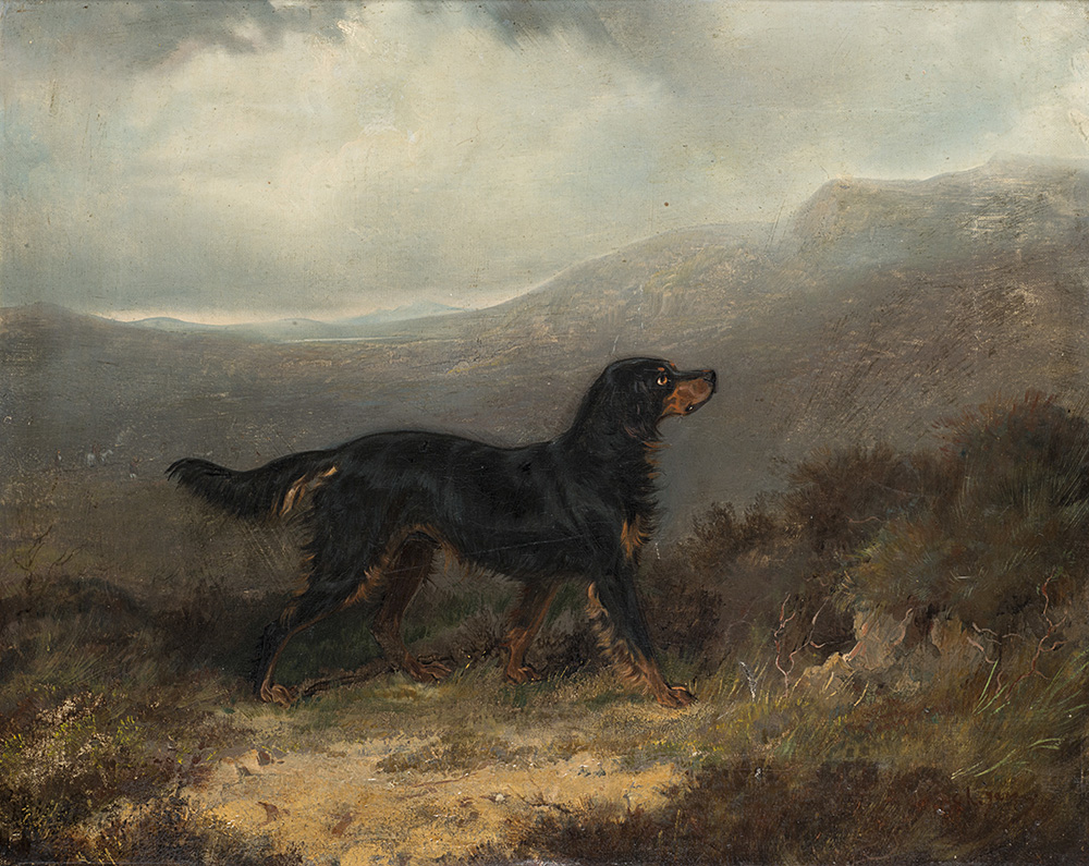 Undeciphered signature "Setter Gordon in a landscape" oil on canvas (cm 36x45) Signed and framed (minor defects)