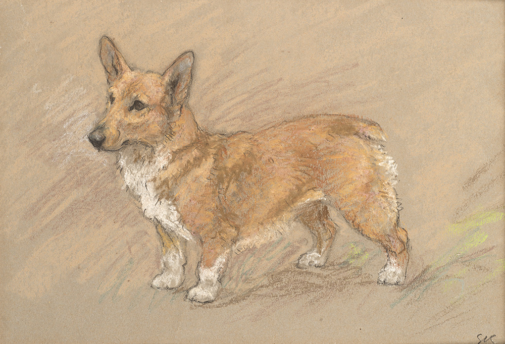 Scuola inglese, secolo XIX "Welsh Corgi" matita e pastelli su carta (cm 27x36) Siglato in basso a destra. In cornice