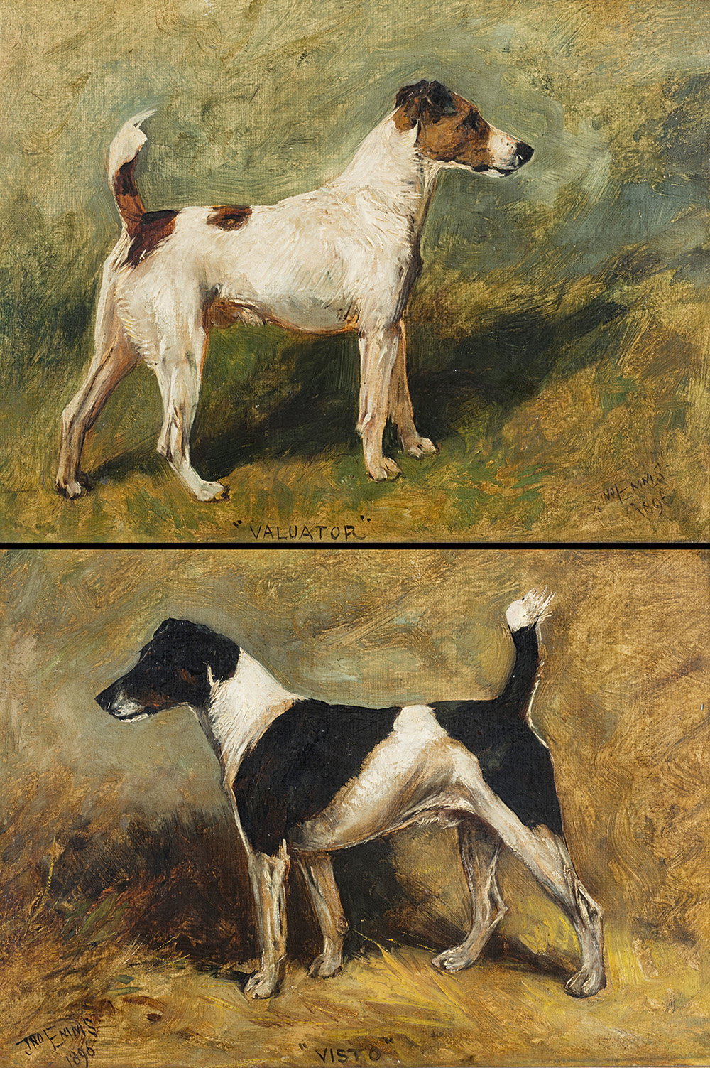 "Visto and Valuator. Fox Terriers" a pair of oil paintings on canvas (cm 25x36) Signed and dated 1896. Framed
