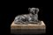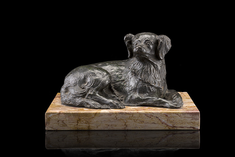 19th-century sculptor "Crouching papillon dog" bronze group (h. cm 13) on marble base