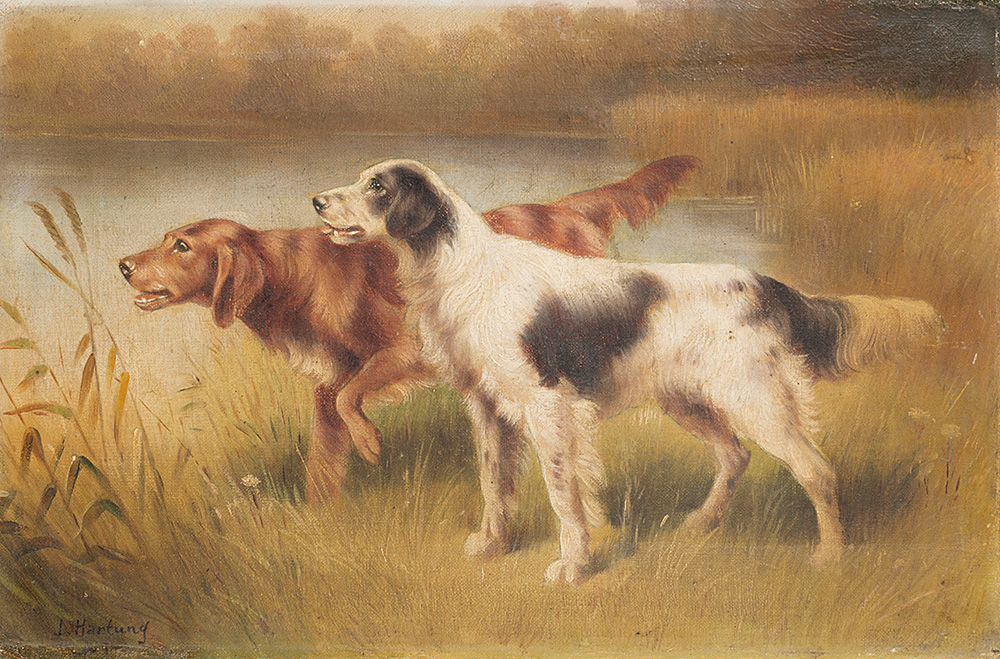 J. Hartung (1836-1918) "English Setter and Ireland Setter in a landscape" oil on canvas (cm 19,5x30,5). Signed at the bottom left. Framed.