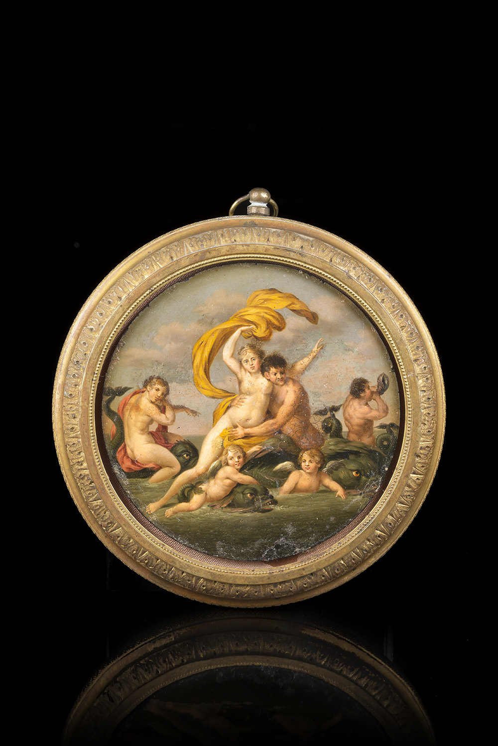 Ignoto del secolo XVIIIScena mitologicaMiniatura ad olio su tavola diam. cm 9...