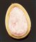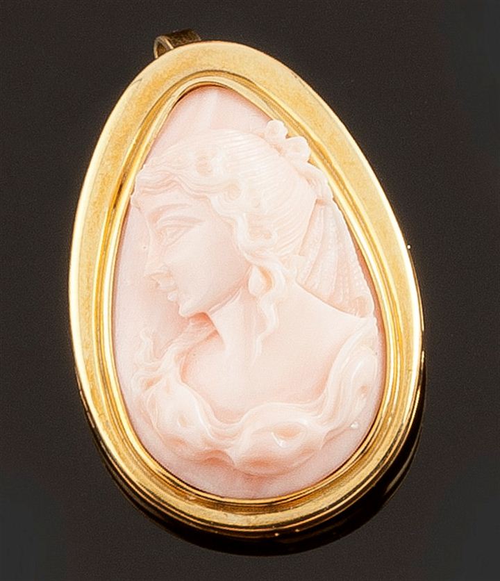 Spilla ciondolo in oro giallo con cammeo in corallo rosa inciso raffigurante volto femminile