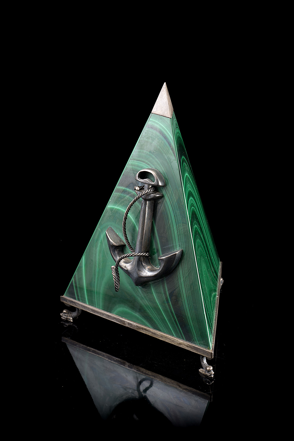 Piramide di marmo lastronata in malachite mammellare con parti in metallo argentato, piedi a forma di delfino e grande ancora Ammiragliato su uno dei lati.