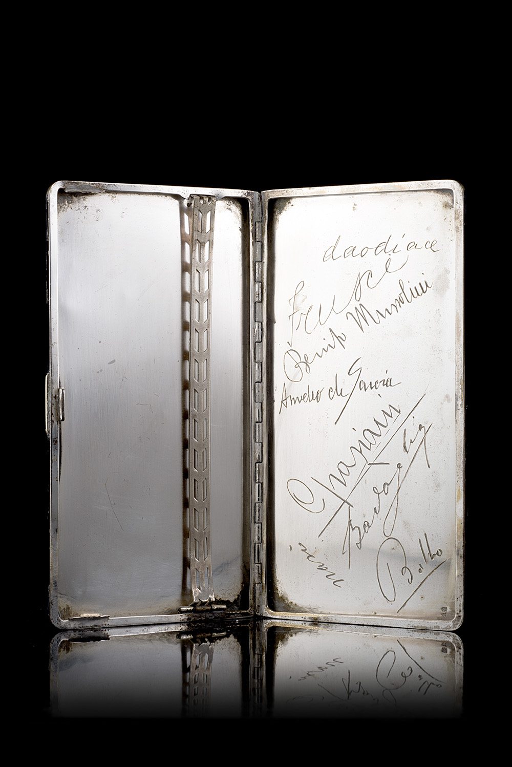 Portasigarette in metallo bianco con pareti esterne lavorate a guilloche e recante all'interno importanti autografi di personaggi inseriti nel contesto storico della guerra d'Etiopia, in particolare: Benito Mussolini, Amedeo di Savoia, Pietro Badoglio, Italo Balbo, Rodolfo Graziani, Giuseppe Daodiace, Guglielmo Nasi e Luigi Frusci.