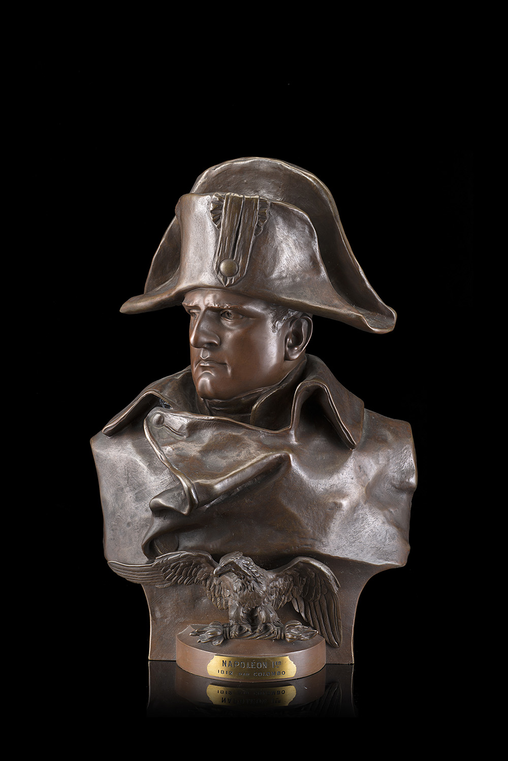 Grande busto in bronzo di Napoleone I imperatore, effigiato con feluca e redingote con aquila ad ali aperte sul petto.