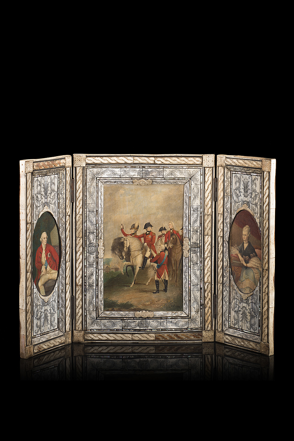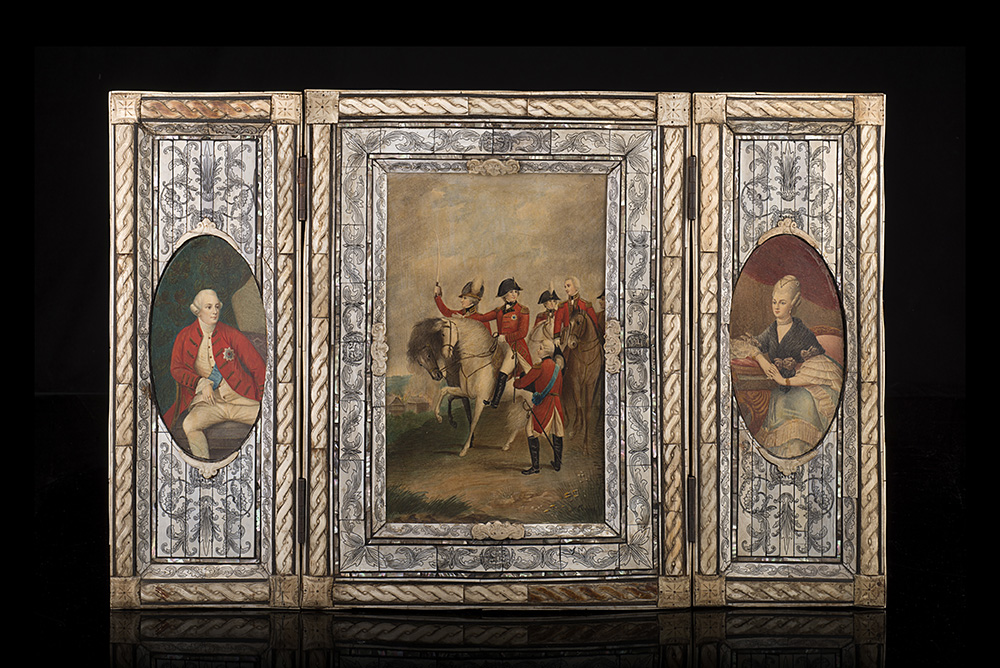 * Trittico in avorio intarsiato e filettato in madreperla. Parte centrale dipinta su avorio con generale a cavallo attorniato dal suo stato maggiore, firmata Cosivay in basso a destra. Ante decorate da due ovali con ritratti di generale e consorte.