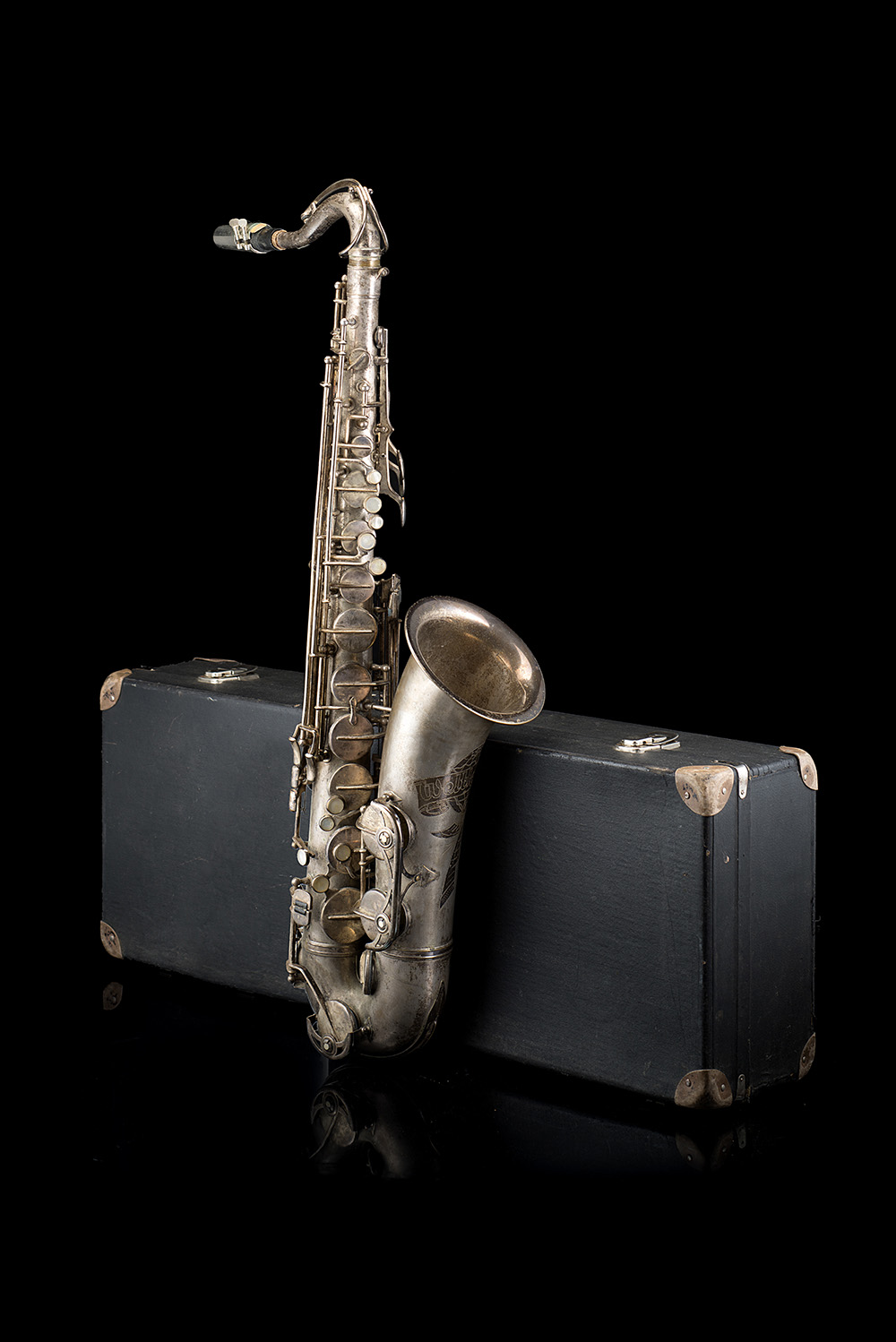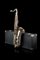 Tenor Saxophone by Wetklang. Germany, 1960s-1970s ca. In silvered metal, engraving on the bell "Weltklang", matr. n. 12828. With case.