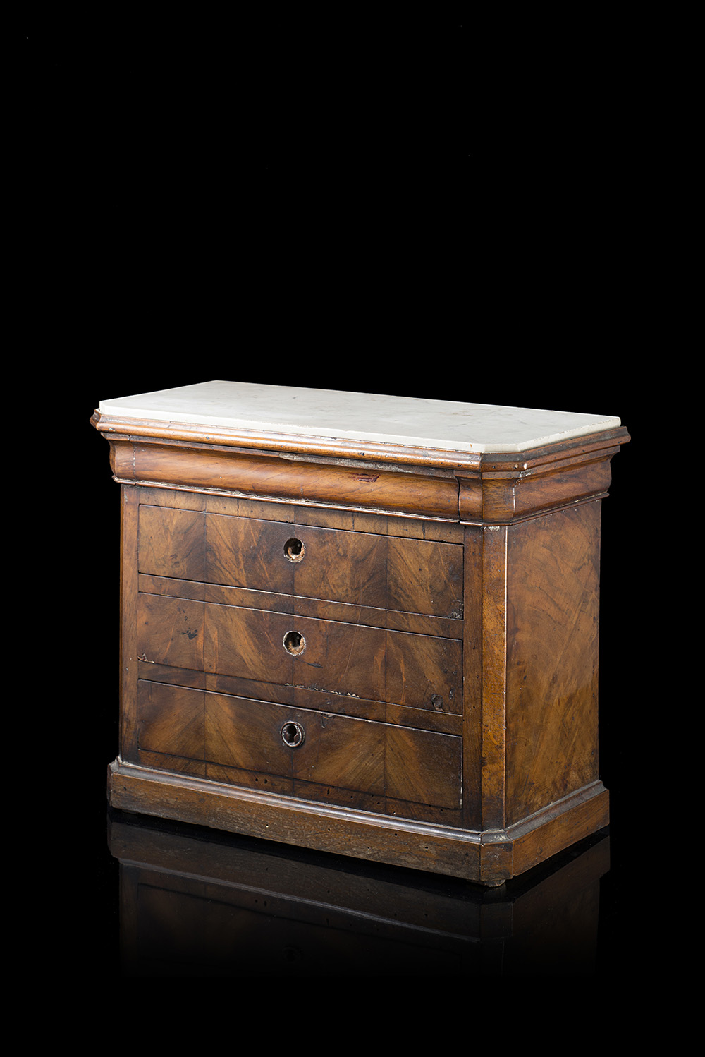 Modello di comò lastronato in noce a tre cassetti. Piano in marmo di forma sagomata (cm 37x18x31) Secolo XIX (difetti)