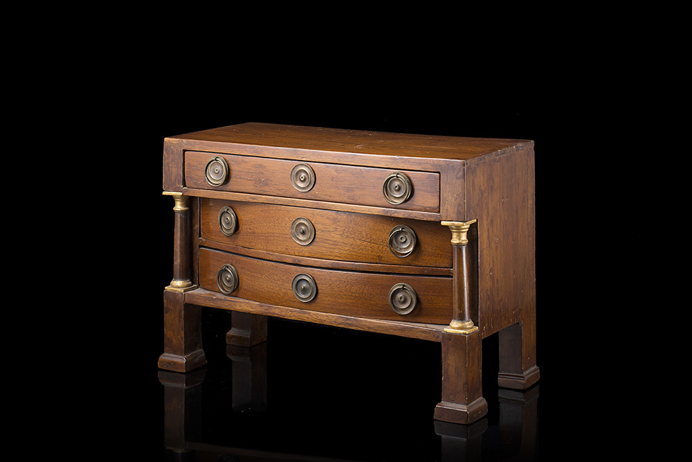 Modello di comò Impero con fronte a due cassetti bombati e uno sottopiano. Montanti a colonna tornita con capitelli dorati. Piedi a plinto (cm 33x14x23) Secolo XIX (difetti)