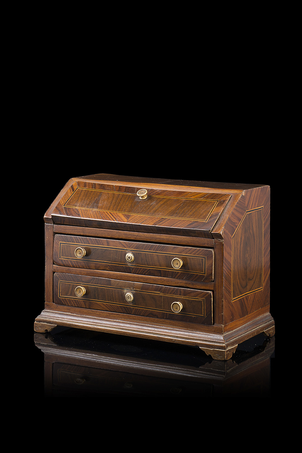 Modello di ribalta lastronata e filettata in bois de rose e boise de violette a tre cassetti. Pomoli in avorio (cm 21x16x13) (difetti)