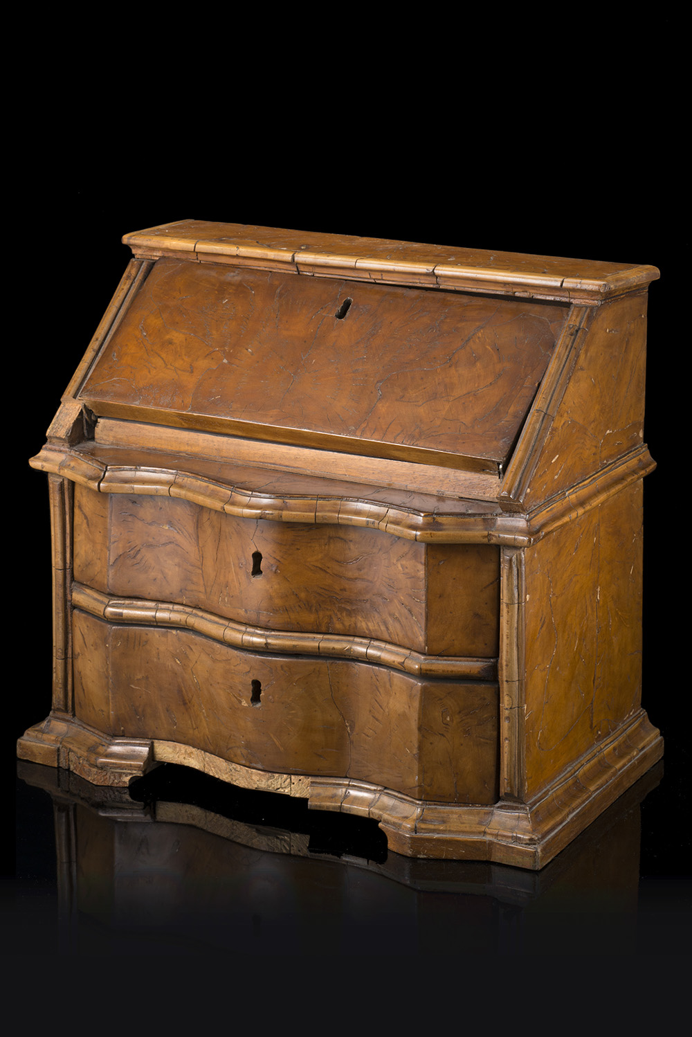 A burr walnut veneered miniature fall-front desk. Veneto, 18th century (cm 44x44x25) (defects and losses)