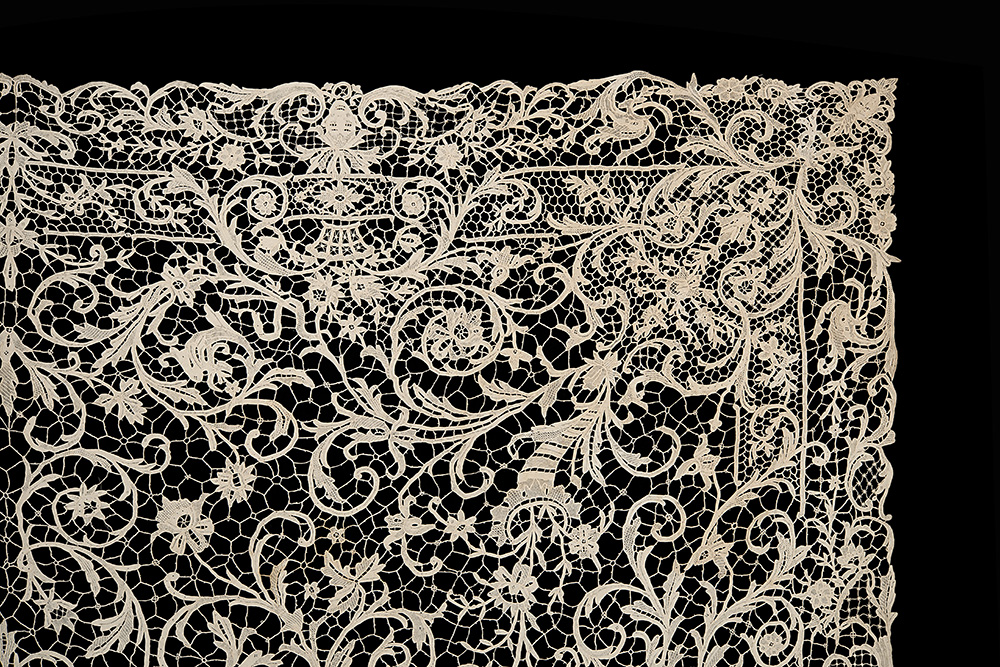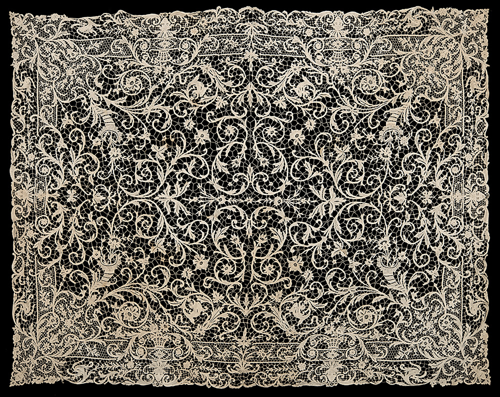 Copritavolo rettangolare in pizzo punto Venezia in cotone. Decoro formato da quattro cornucopie agli angoli, da cui dipartono rami fioriti uniti dai caratteristici ponticelli. La cornice è ornata da mascheroni sovrastati da cesti intrecciati e volute . Italia prima metà secolo XX (cm 220x300) (lievi difetti)