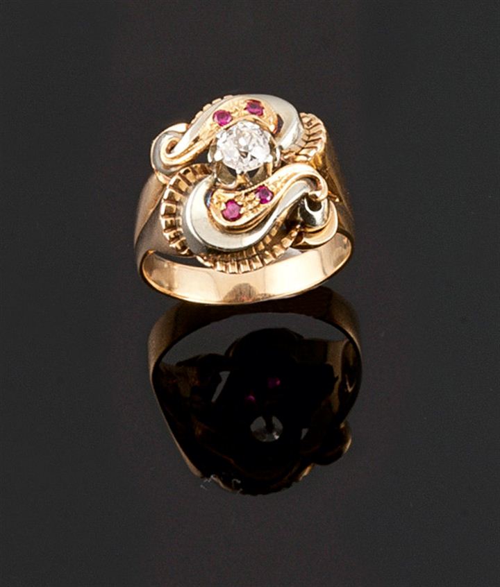 lavorata ad intreccio con al centro diamante taglio brillante di vecchio taglio di ct 0,35 ca e piccoli rubini sintetici