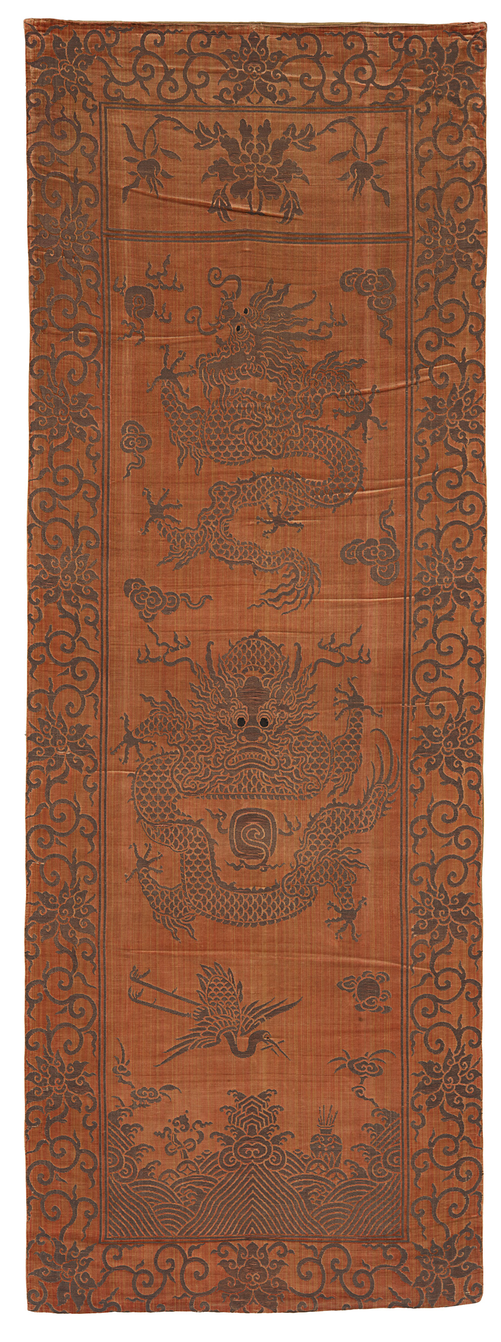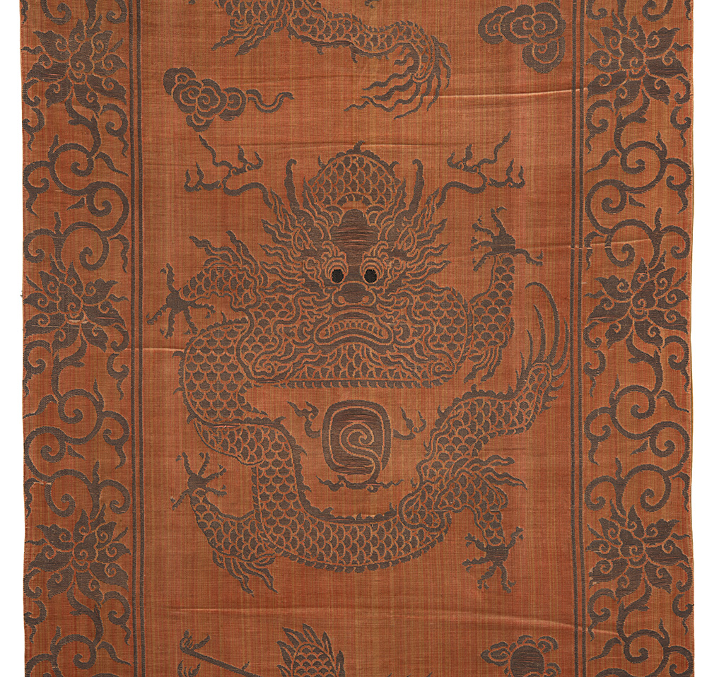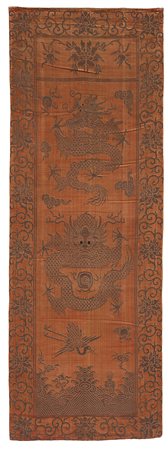Pannello in velluto di seta color rosso bruno, tessuto a mano e broccato in argento. Utilizzato come copri trono per dignitari di corte o familiari dell'Imperatore. Decorato con un drago frontale a fauci spalancate, sovrastato da un drago serpeggiante di profilo, entrambe con zampe a cinque artigli. Nella parte inferiore una gru in volo sopra la Montagna Sacra, circondata da onde spumeggianti, con il simbolo della sapienza nel becco. Numerosi simboli Taoisti. Bordura a meandro con fiori di loto (cm 170x61) (lievi difetti)