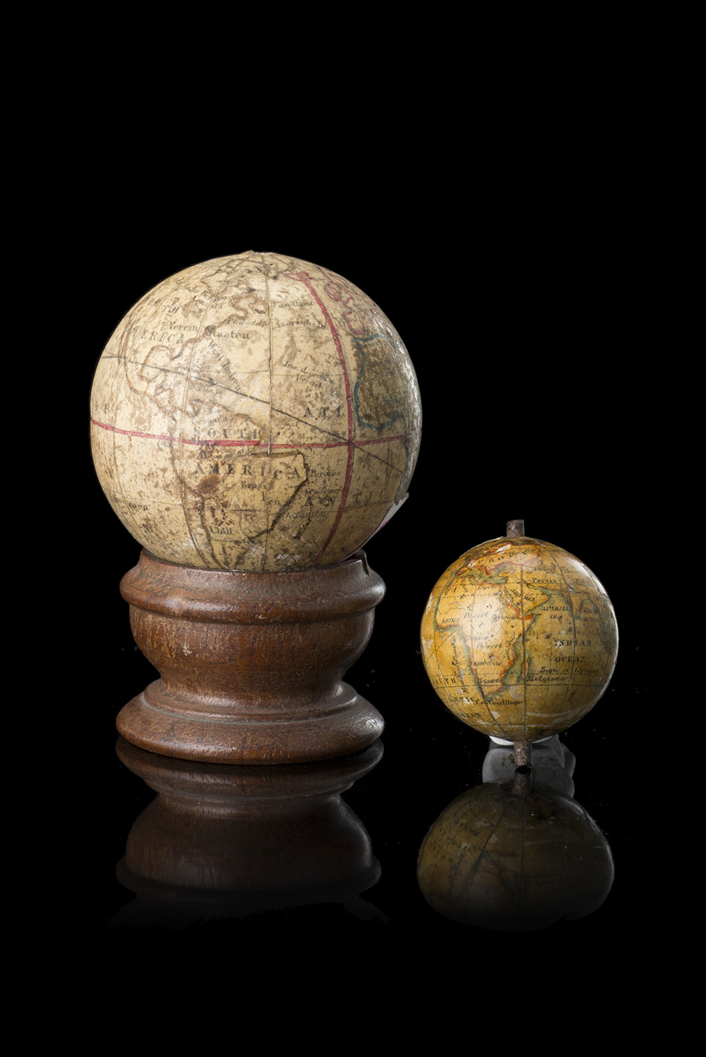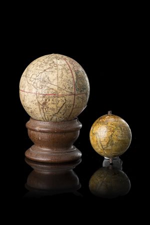 Lotto composto da due piccoli globi terrestri del secolo XIX, uno con base in legno tornito (difetti)