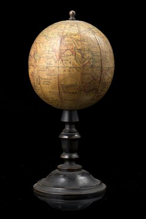 Piccolo globo terrestre, editore J. L. and Co, secolo XIX. Poggiante su base in legno tornito (h. cm 16) (difetti)