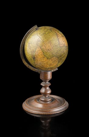 Piccolo globo terrestre, editore Newtons and Son, Londra, secolo XIX. Poggiante su base in legno tornito (h. cm 15) (difetti e restauri)
