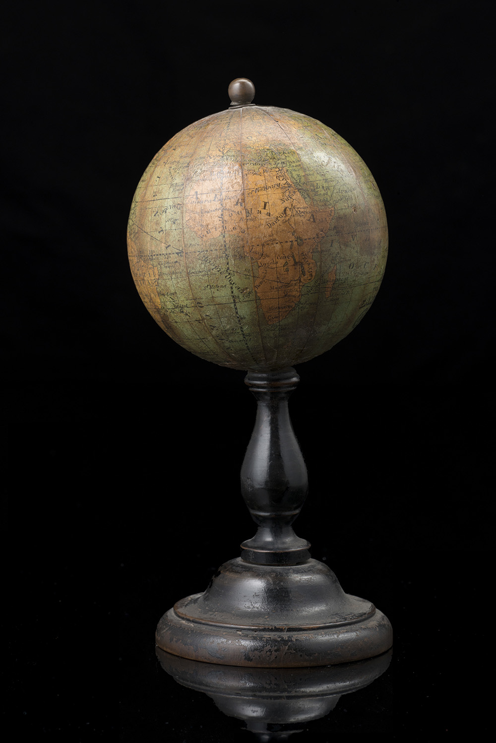 Piccolo globo terrestre, editore A.K. Germania, fine secolo XIX. Poggiante su base in legno tornito ed ebanizzato (h. cm 16) (difetti)