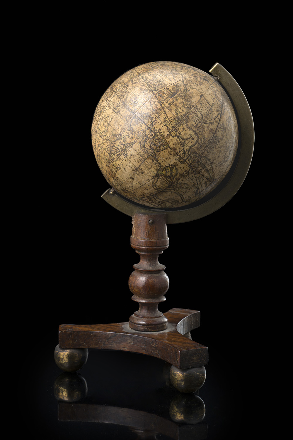Globo celeste poggiante su base tripode in legno con piedini in metallo dorato. Secolo XIX (h. cm 16) (restauri)