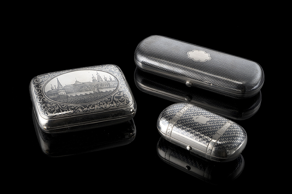 Lotto composto da tre scatole in argento e niello, decorate rispettivamente da veduta di Mosca e motivi a scacchi. Manifattura europea/russa, prima metà secolo XX (cm 7x5 ca.) (g lordi 65 ca.); (cm 10x3,5 ca.) (g 88 ca.); (cm 6,5x3 ca.) (g 39 ca.) (lievi difetti)
