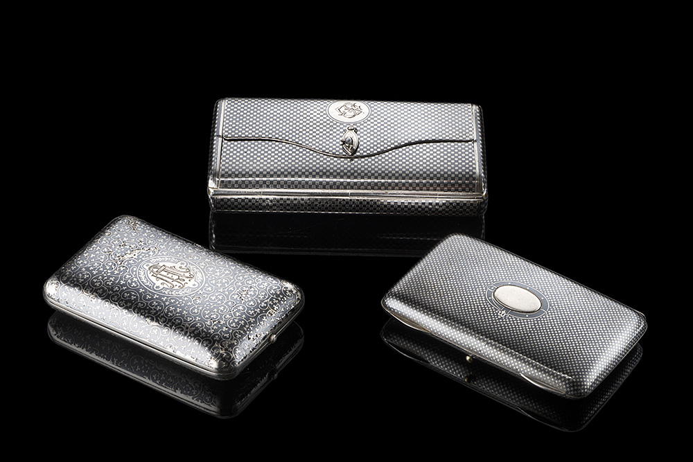 A set of three silver and niello cigarette case. Austro-Hungarian Empire 1866-1922 (cm 9x5,5 ca.) (g 80 ca.); (cm 9x6 ca.) (g 90 ca.); (cm 11,5x6,5x2) (g 160 ca.) (defects)