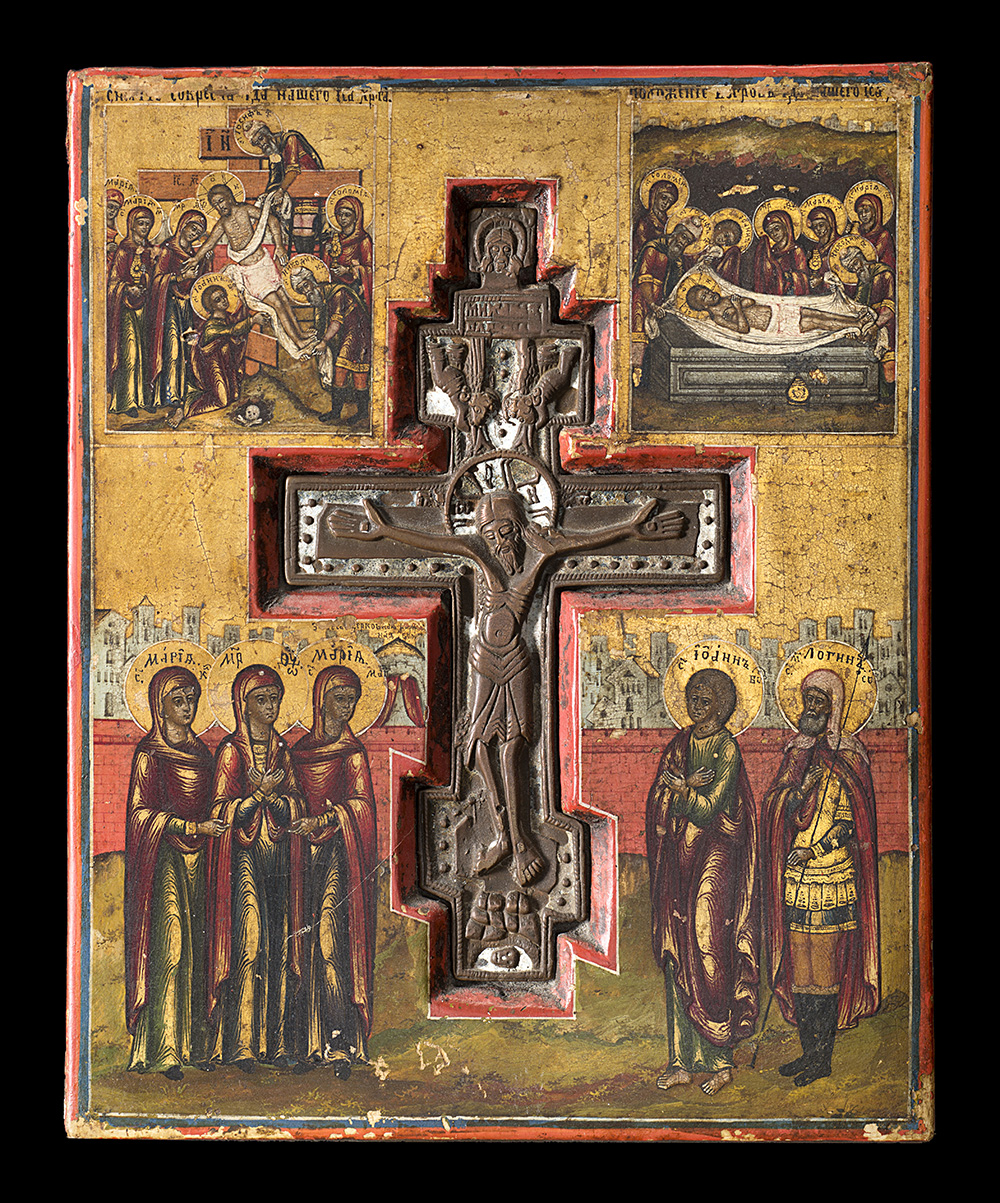 A 19th-century oil on panel icon with a copper and enamels Crucifix (cm 22x18) (defects)