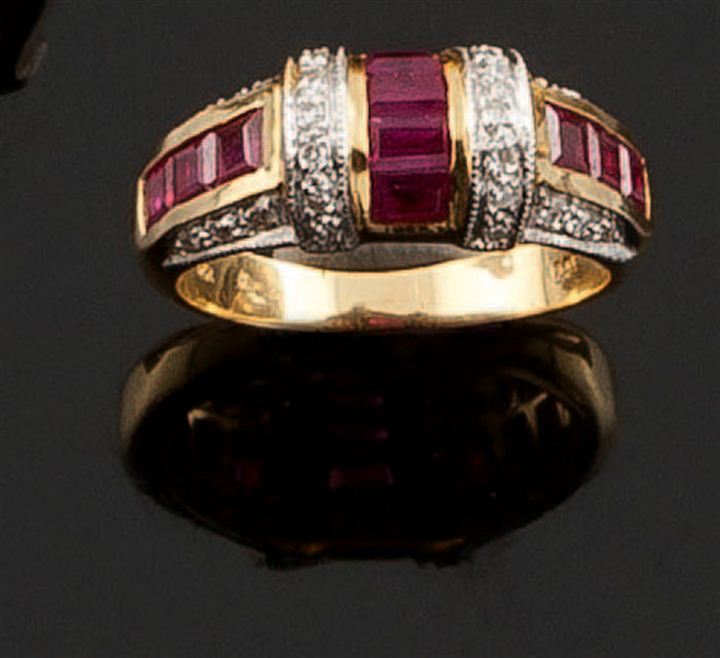 ANELLO Anello in oro giallo, sommità con rubini taglio baguette per...