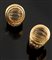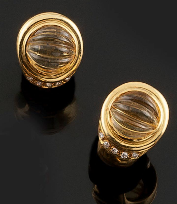 Coppia di orecchini in oro giallo con due quarzi citrini lavorati a segmenti verticali e piccoli diamanti taglio brillante