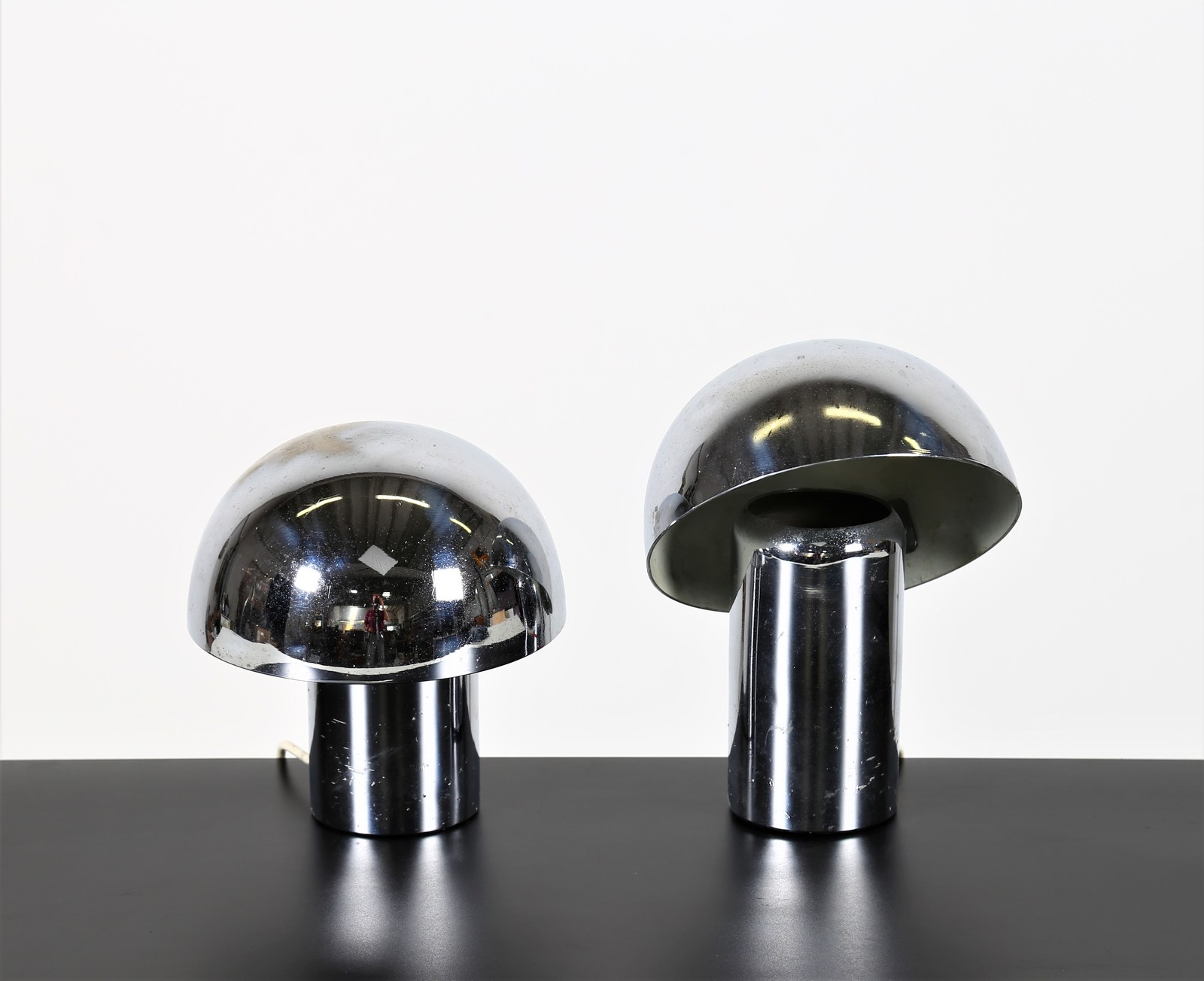 ITALIAN MANUFACTURE Pair of chromed metal bedside lamps, 1970s. . Cm 18,00 x 22,00 x 18,00.