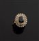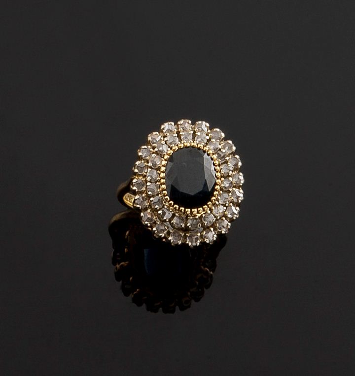 Anello in oro giallo ed argento con al centro zaffiro di taglio ovale, doppio contorno di piccoli