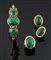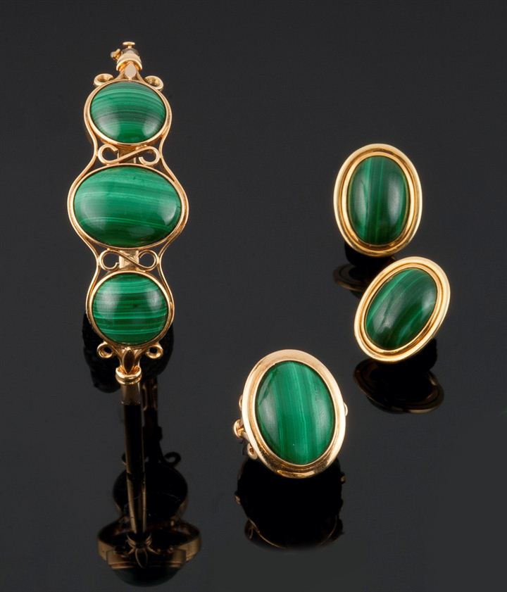 Demi-parure in oro giallo composta da anello, coppia di orecchini e bracciale con malachiti
