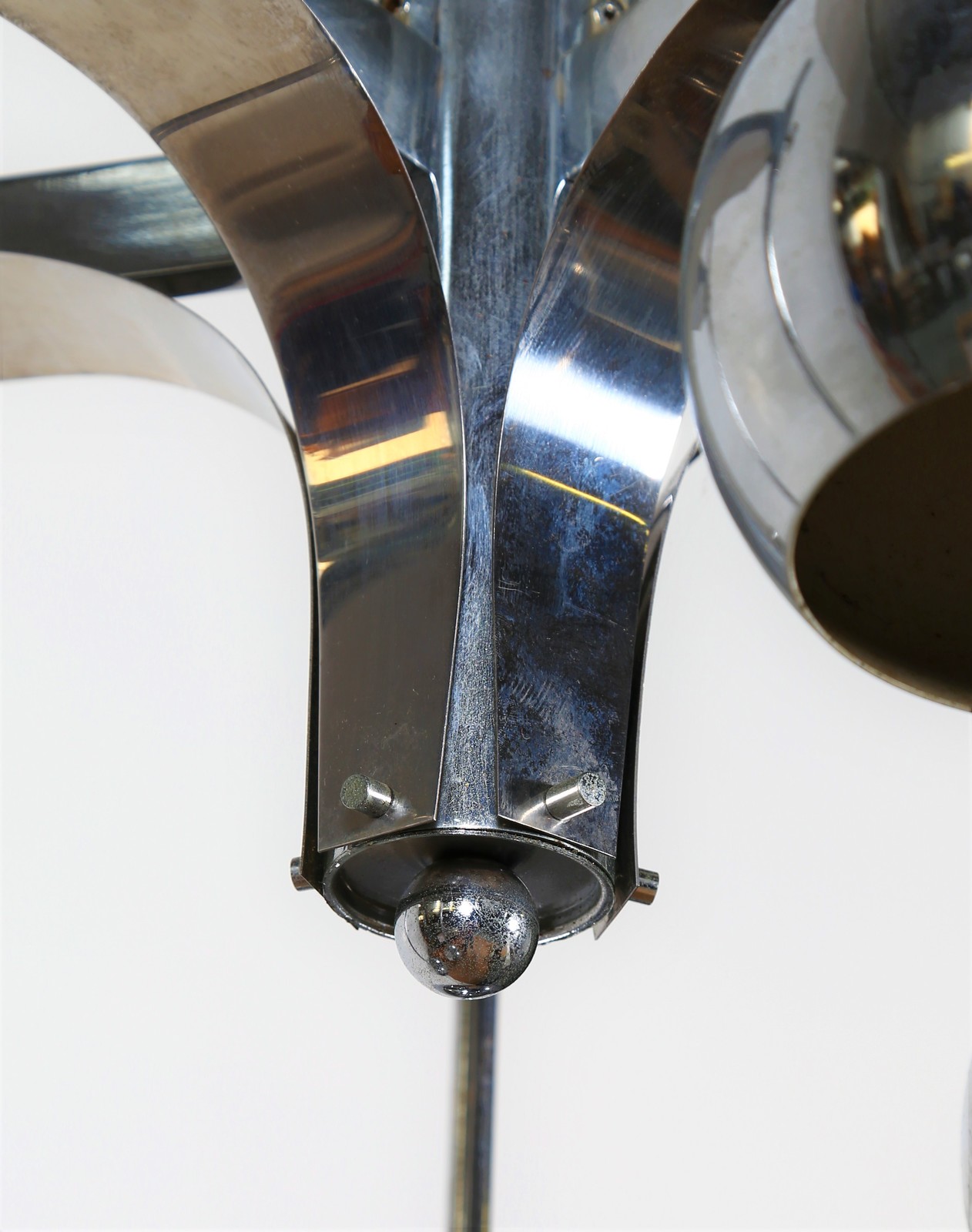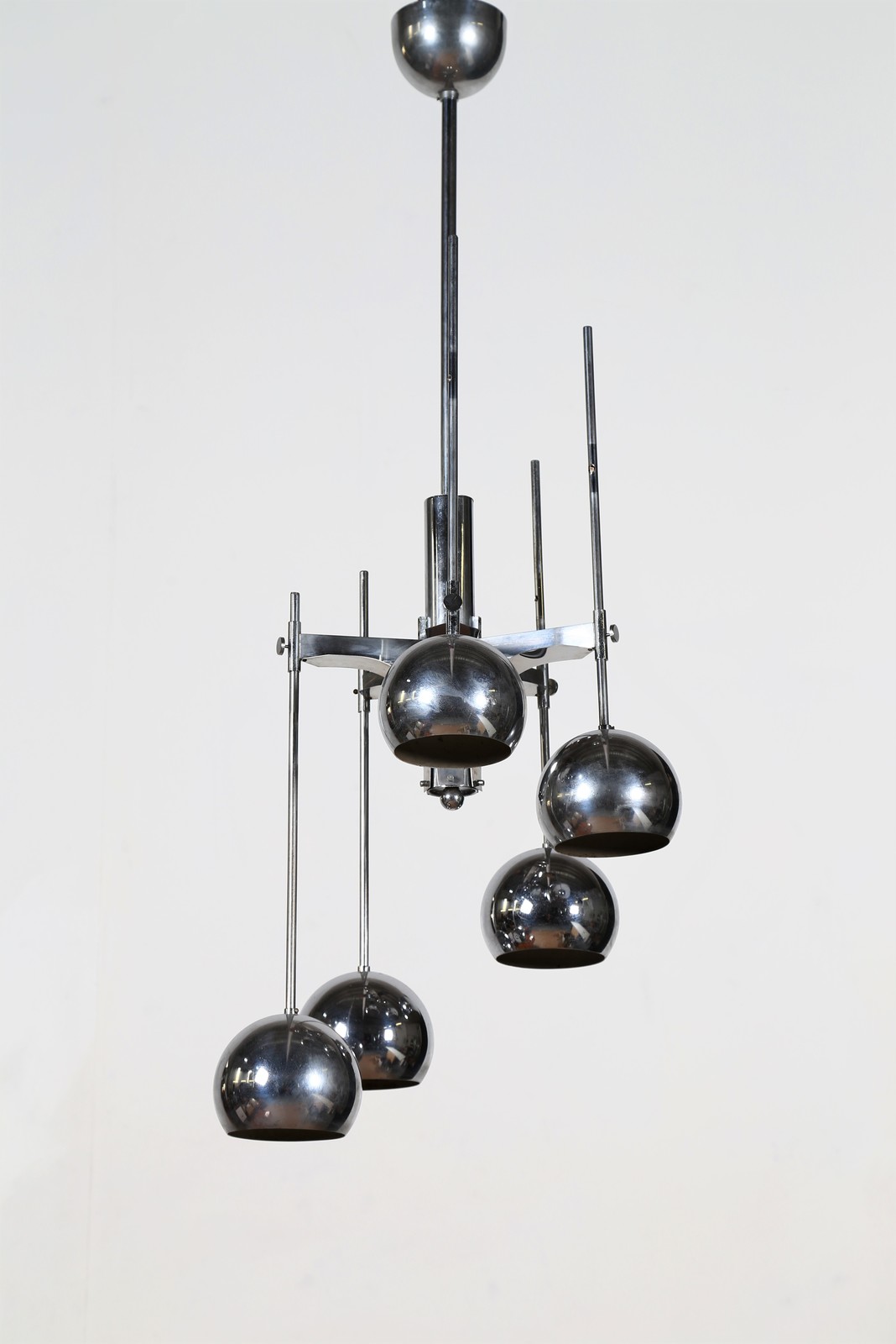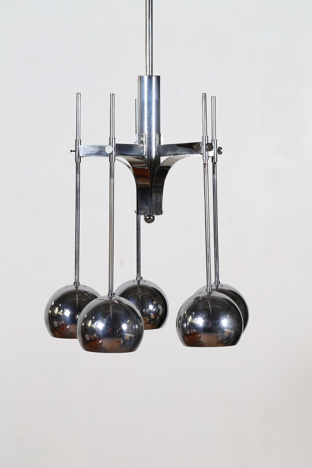 ITALIAN MANUFACTURE Chromed metal chandelier with five adjustable lights, 1960s. . Cm 48,00 x 110,00 x 48,00.